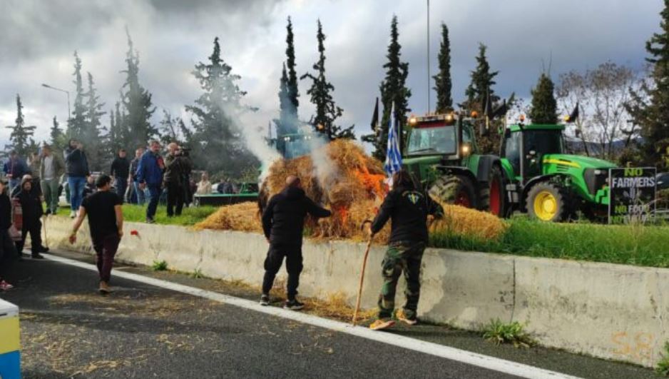 Σύμφωνα με τα όσα μετέδωσε το Mega, οι αγρότες άπλωσαν συμβολικά μπάλες με άχυρα και στη συνέχεια έβαλαν σε αυτές φωτιά. Σημειώνεται ότι οι αγρότες πέταξαν στο οδόστρωμα και γάλα.