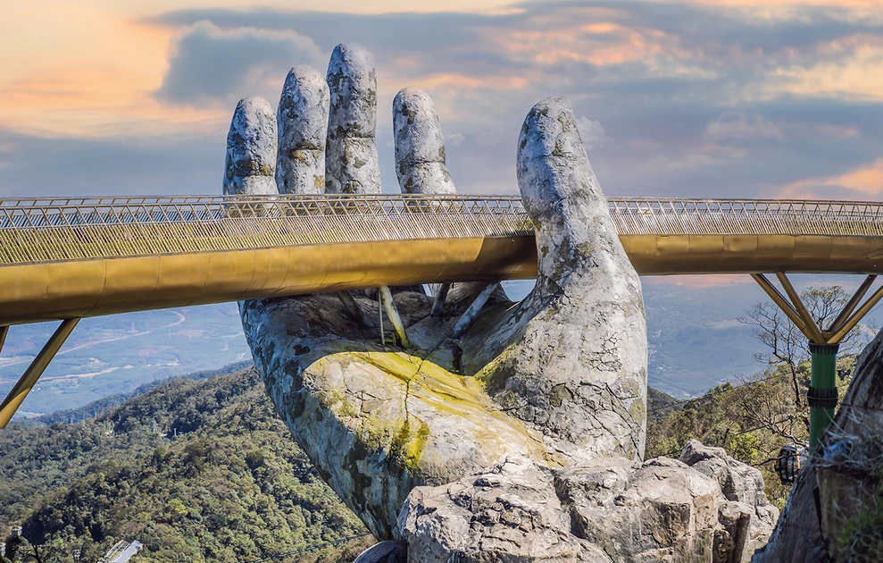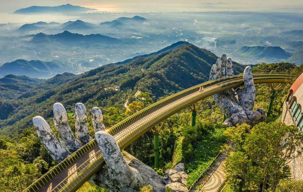 Κρεμασμένη πάνω από το καταπράσινο ορεινό τοπίο με θέα προς τη Da Nang, η γέφυρα συνδυάζει εντυπωσιακή αρχιτεκτονική, καλλιτεχνικό συμβολισμό και μια εμπειρία θέασης που ξεκινά πριν ακόμη την περπατήσεις.